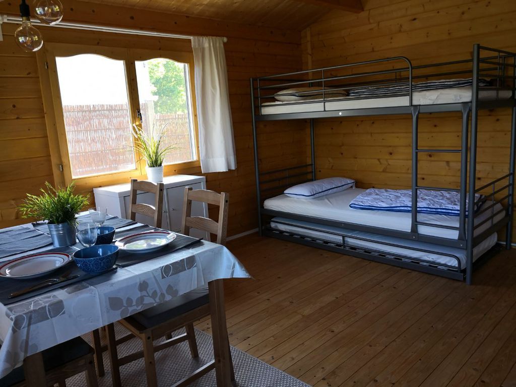 The cabin is family-friendly with a pull-out bed for 2 people and a bunk bed. At one table you will find space to eat, chat and play.