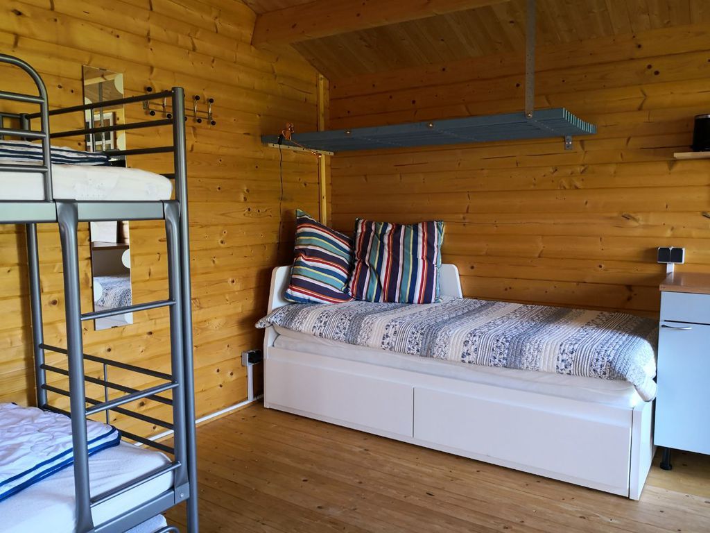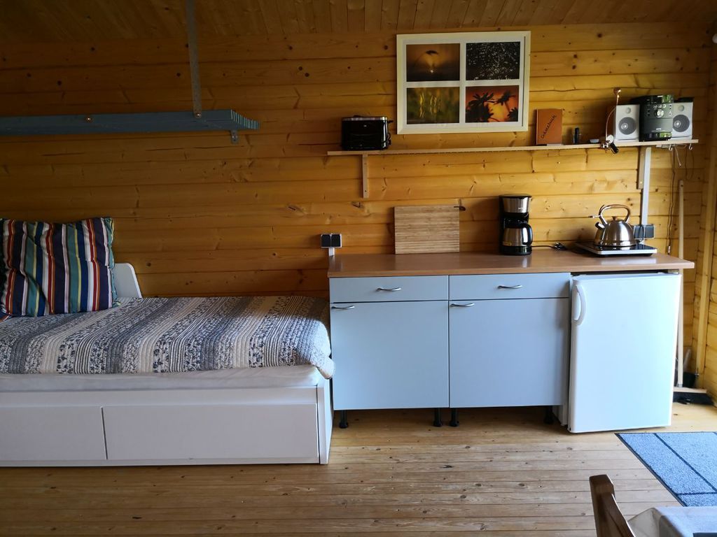 The kitchenette has a refrigerator, dishes and cooking utensils for 4 people and an induction hotplate. Of course there is also a coffee machine. There are plenty of sockets, as well as a TV and an audio system. If necessary, the cabin can be heated with a modern electric heater. Behind the cabin a small tool shed for storing things that are not needed can be found. Outside you will also find a table and chairs, a parasol and two loungers for 4 people. Please bring your own bed linen and towels! The cabin does not have its own sanitary facility as there is no water connection. Our sanitary building is only a few steps away.